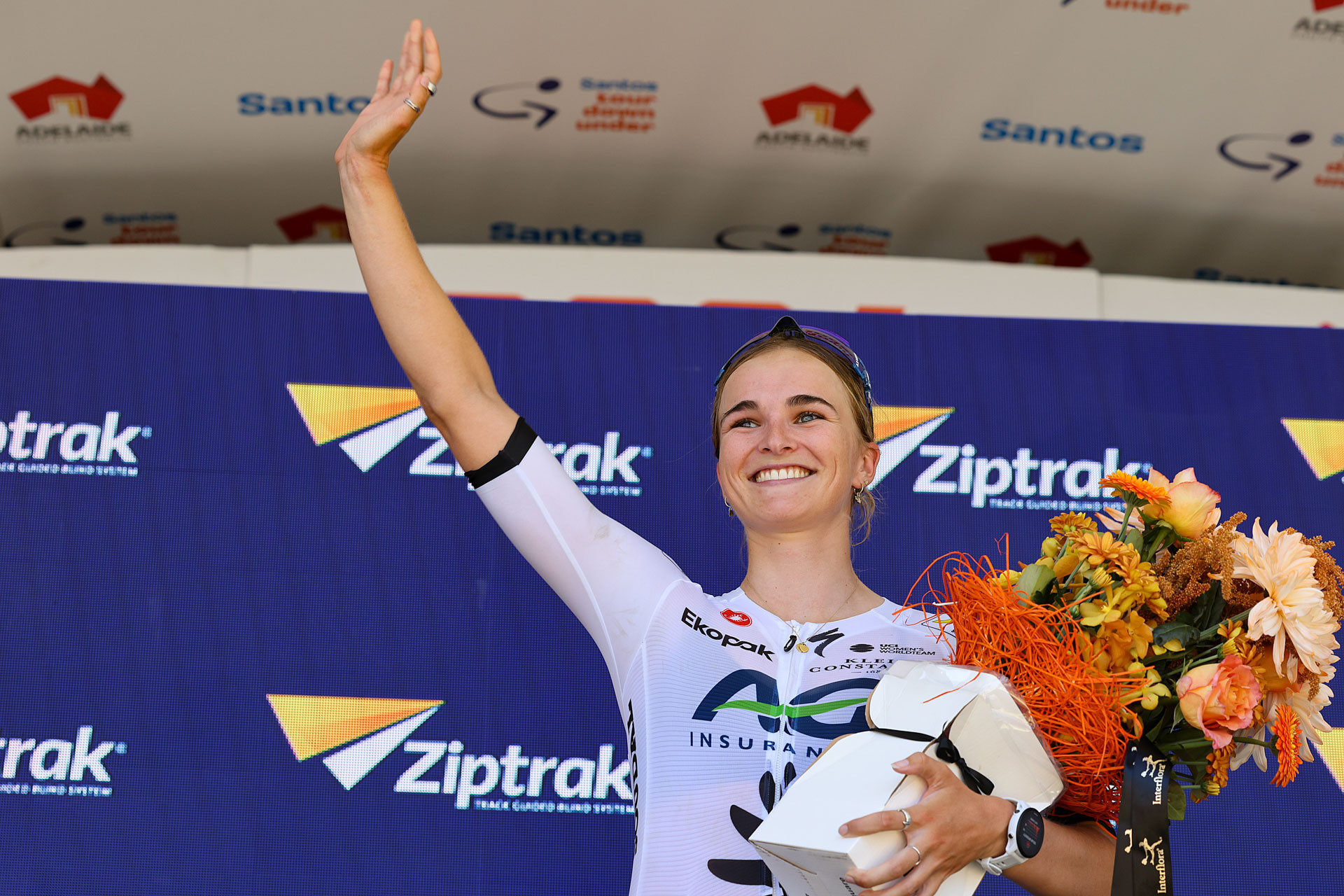 Ally Wollaston bezorgt AG Insurance – Soudal een glorieuze dag door de eerste etappe van de World Tour Race – Santos Tour Down Under op haar naam te schrijven. De etappe, die de rensters van Hahndorf naar Campbelltown leidde, was met een lengte van 93,9 kilometer een ware beproeving. Na een veeleisend parcours onder hoge temperaturen, maakte Ally het verschil in de sprint, waarbij ze haar concurrenten achter zich liet.